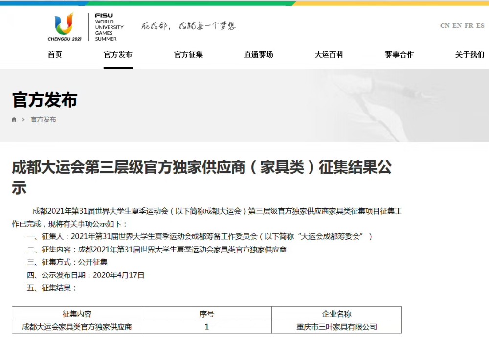 三叶集团以集团化资源为成都2021世界大运会提供家具类产品和服务,为成都2021世界大运会的品牌传播贡献力量,成就每个梦一想。