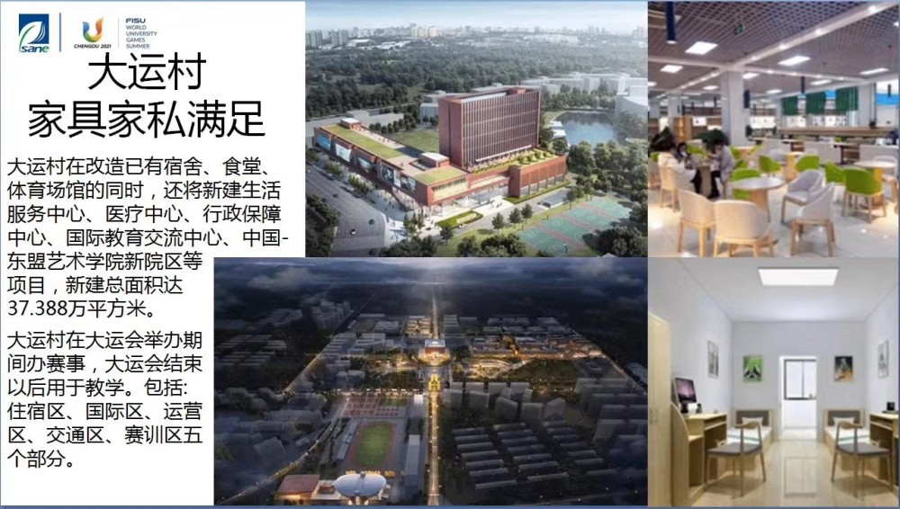 成都2021年大运会运动员村选址成都大学,已于2019年4月18日正式启动建设。大运村新建项目共计37.4万平方米,包括运动员公寓、生活服务中心、医疗中心、行政保障中心、国际教育交流中心、体育馆附馆、游泳馆和东盟艺术学院等8个项目。